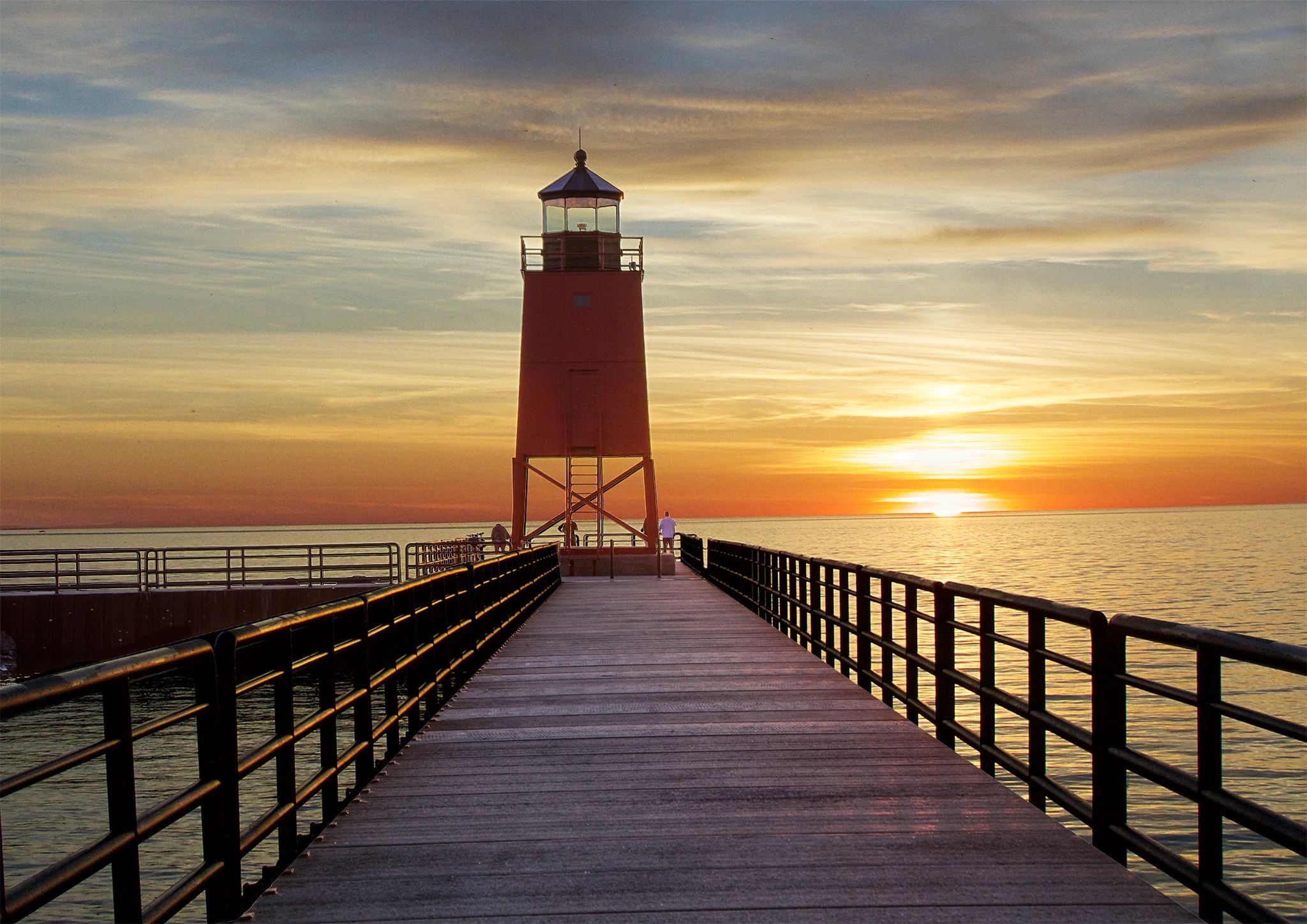 Light houses are a particular fancy of mine. We live on Lake Michigan in the summertime and, exploring the Lake Michigan coast, I find plenty of them. This lighthouse is at Charlevoix Michigan. I caught it at sunset. The handrails caught the reflection from the setting sun. They bring the viewer's eyes out to the silhouetted lighthouse and then to the sunset beyond. When I gaze at this image, my eyes are pulled into it and I can lose myself In memories of Northern Michigan.