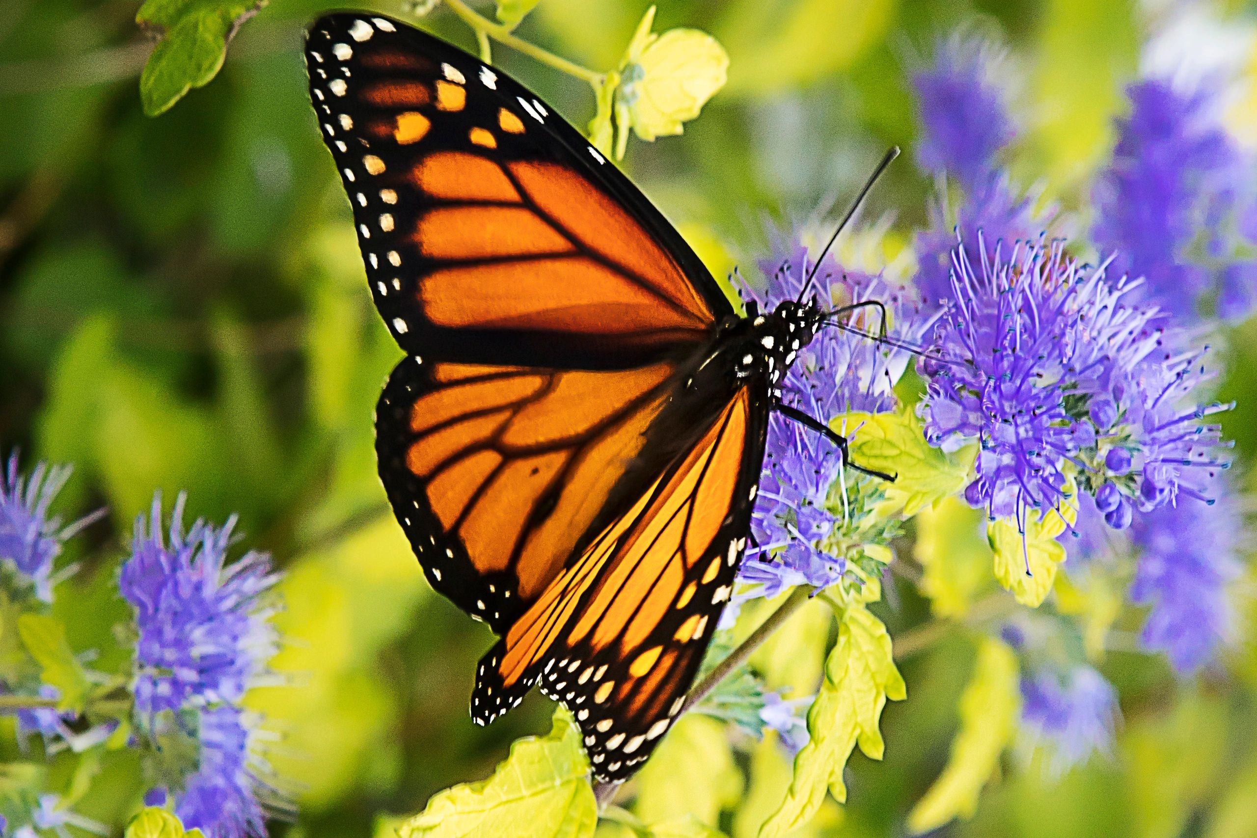 We have a hedge along the southern side of our Lake Michigan house. In late autumn it blossoms beautiful light blue flowers. One day a few years ago I was in the house when I noticed that there were at least 20 beautiful monarch butterflies on the hedge out the window. They were feasting on pollen from the flowers. I grabbed my camera and scooted out the door. The butterflies paid no attention to me. They were enraptured by the pollen and probably tired since they were on their annual journey from north America to Mexico. It’s always good to have a camera nearby just in case an opportunity like this pops up.