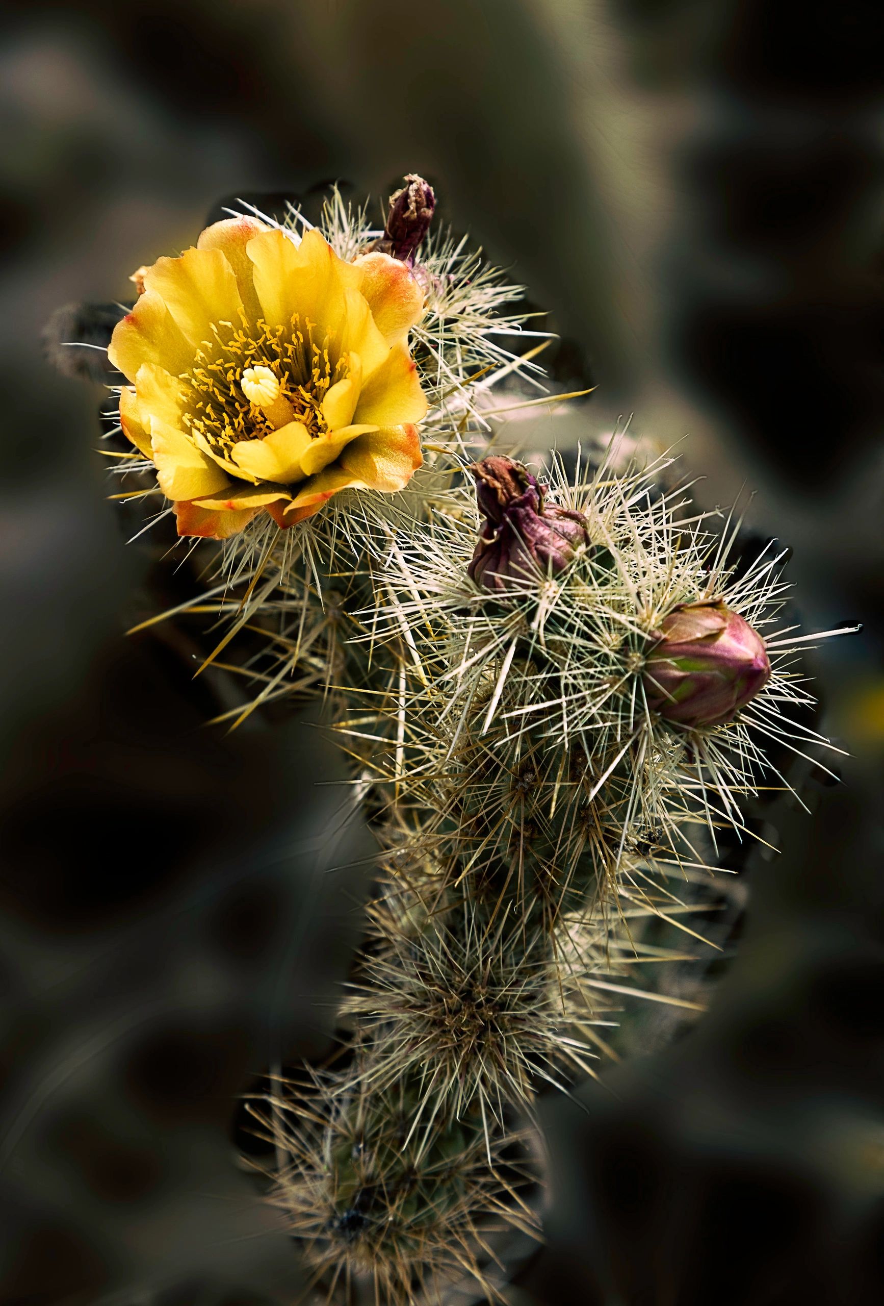 We live in North County, San Diego, in the winter. It is about a two our drive from there to Anza-Borrego Desert State Park. I went there last April looking for desert flowers and found this gem. I applied a dark green color cast to the picture, shielding the yellow flower from it. I blurred the background a little more than it had been out of the camera and produced this image. I like it so well that it is the wallpaper on my iPhone.