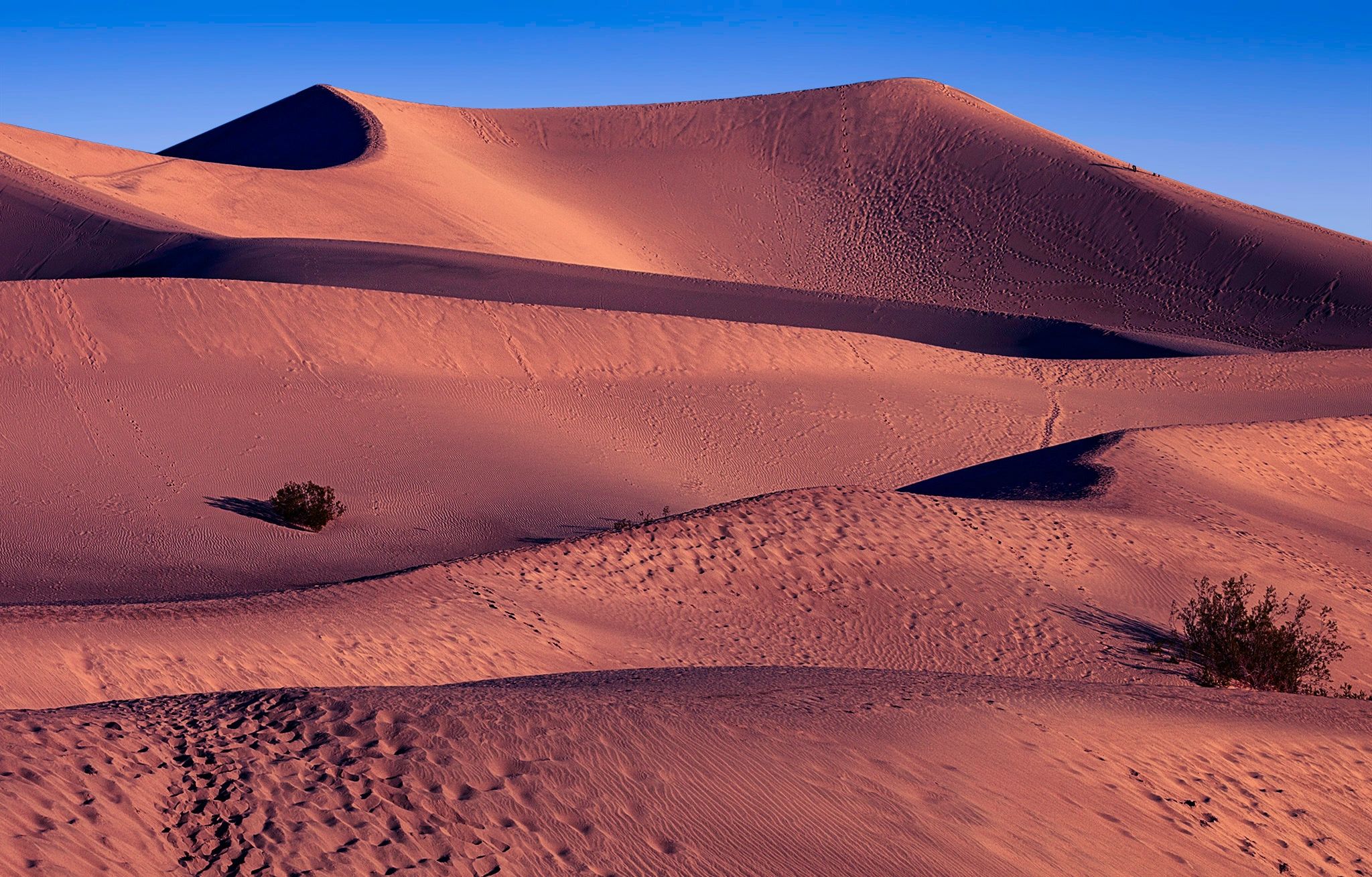 Last December I went to explore Death Valley. The first morning I was there I went to Mesquite Flats Sand Dune. Being at the dunes in the morning gave me great light, bringing out the highlights and shadows. But the sun was rapidly moving up in the sky toward clouds that would ruin the effect. So I strapped on my backpack of equipment and trudged through the sand to a high point. I brought out my telephoto lens and caught this image just in time, before the sun disappeared. I replaced the distant mountains behind the dunes with blue sky giving the dunes a much greater feeling of height. I enhanced the shadows with a touch of purple, and brought out the highlights in their natural sand color. Sometimes you win a race with the sun and are rewarded with an image like this.