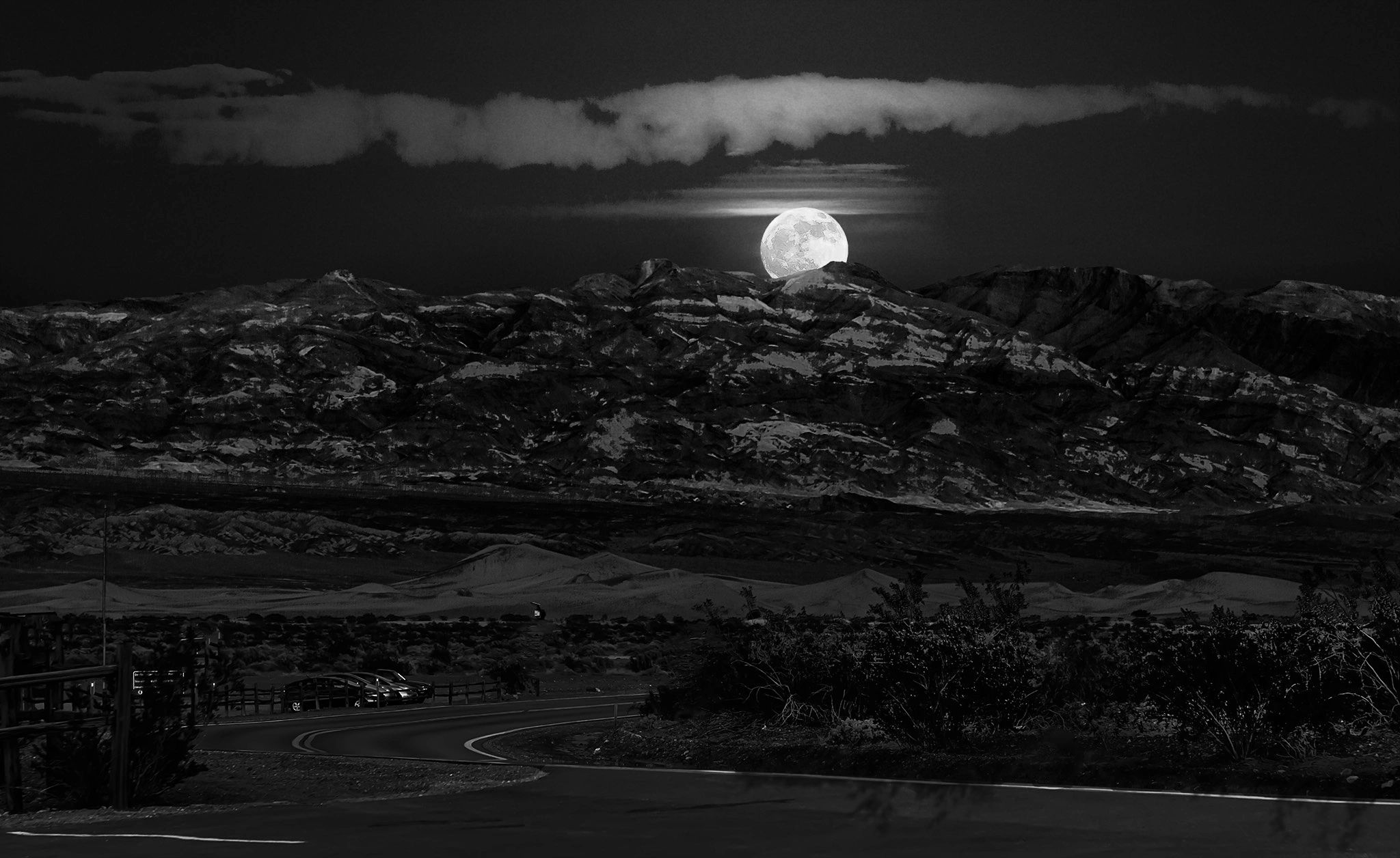 I was finishing 2 1/2 days of driving around Death Valley capturing images. After sunset, I drove back to the motel and stopped at the convenience store across the street. As I walked to the store from the parking lot, the door of the store burst open and a guy ran right past me. He had a camera. I turned around as he passed and this is what I saw: a super bright totally huge full moon rising from behind the mountain. One more picture.