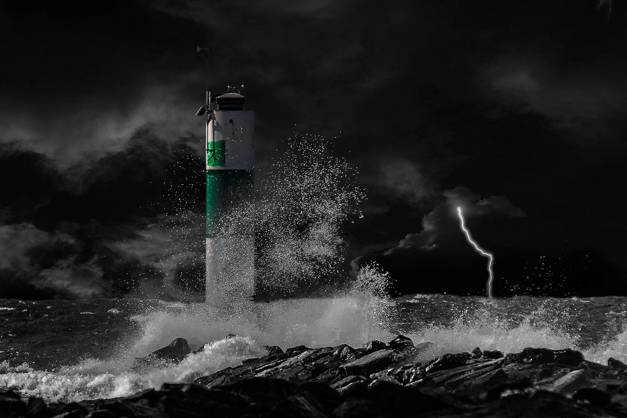 Last summer, gale force winds swept across Lake Michigan. On a rainy day, I drove up to Grand Haven State Park on the shore of the big lake. The wind was howling and I captured a wave breaking on the starboard beacon to the harbor entrance. On the computer, I darkened the scene and added a little drama with a bolt of lightning. I was glad I was standing on the beach that day instead of in my sailboat, rocking and rolling on those angry waves.
