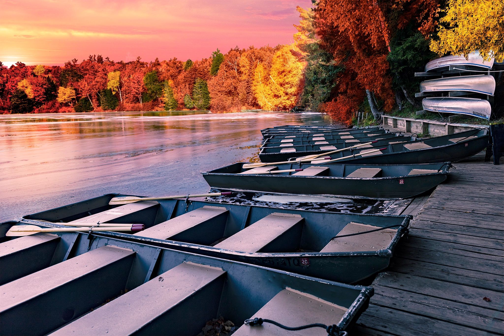 We were in Michigan’s Upper Peninsula last fall. The colors were beautiful. As I walked along a trail that overlooks the lake and a waterfall, I saw a boat livery. There was a stack of canoes and a row of rowboats waiting to be rented. I love images that show repeating patterns. Post processing, I added additional color to the beautiful trees, substituted a sunset sky and added the last glimpse of the sun disappearing behind the trees. To me, this truly is a pleasing image.