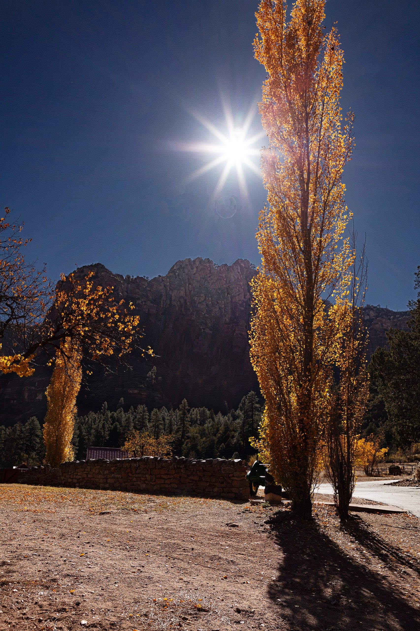 Last November we were in Sedona, marveling at the beauty of so many colorful monuments to nature. While hiking, I saw a golden tree with the bright sun and blue sky behind it. I accepted the challenge of producing an image that captured the moment. I took several exposures to blend them together. I needed one of the sun, darkened down so that it didn't overpower the scene and another of everything else. With help from my computer, this is the striking image I saw on my hike.