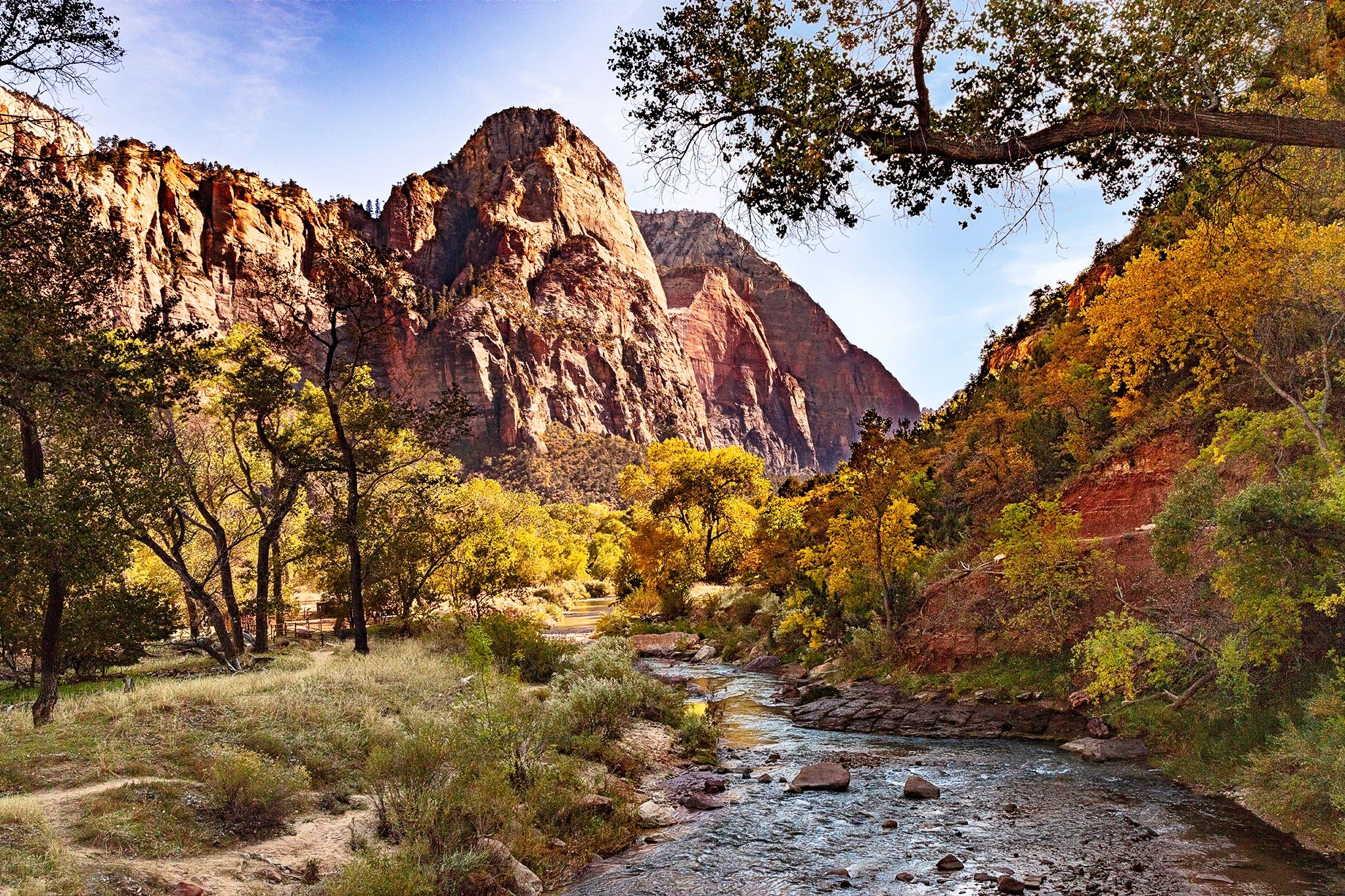 We stopped by Zion National Park last year. It has a lovely drive through majestic mountains and hiking trails that range from easy to totally extreme. On a trail, I saw this view of a meandering stream with green foliage nestled between colorful peaks. The stream guides the viewer into this peaceful image.
